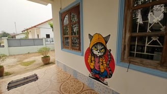 École Francophone de Luang Prabang : Le Chat Bad Boy J'ai eu l'honneur d'être invité à peindre au sein de l'École Francophone de Luang Prabang. J'y ai réalisé un Chat Bad Boy au pochoir. Cette œuvre ludique et contemporaine apporte une touche d'énergie urbaine et de décalage dans un environnement éducatif, suscitant l'intérêt et la discussion chez les élèves.