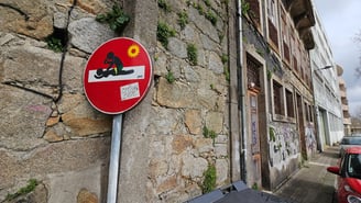 Street art sur panneau de signalisation représentant un tuk tuk sautant un dos d'äne à Lisbonne