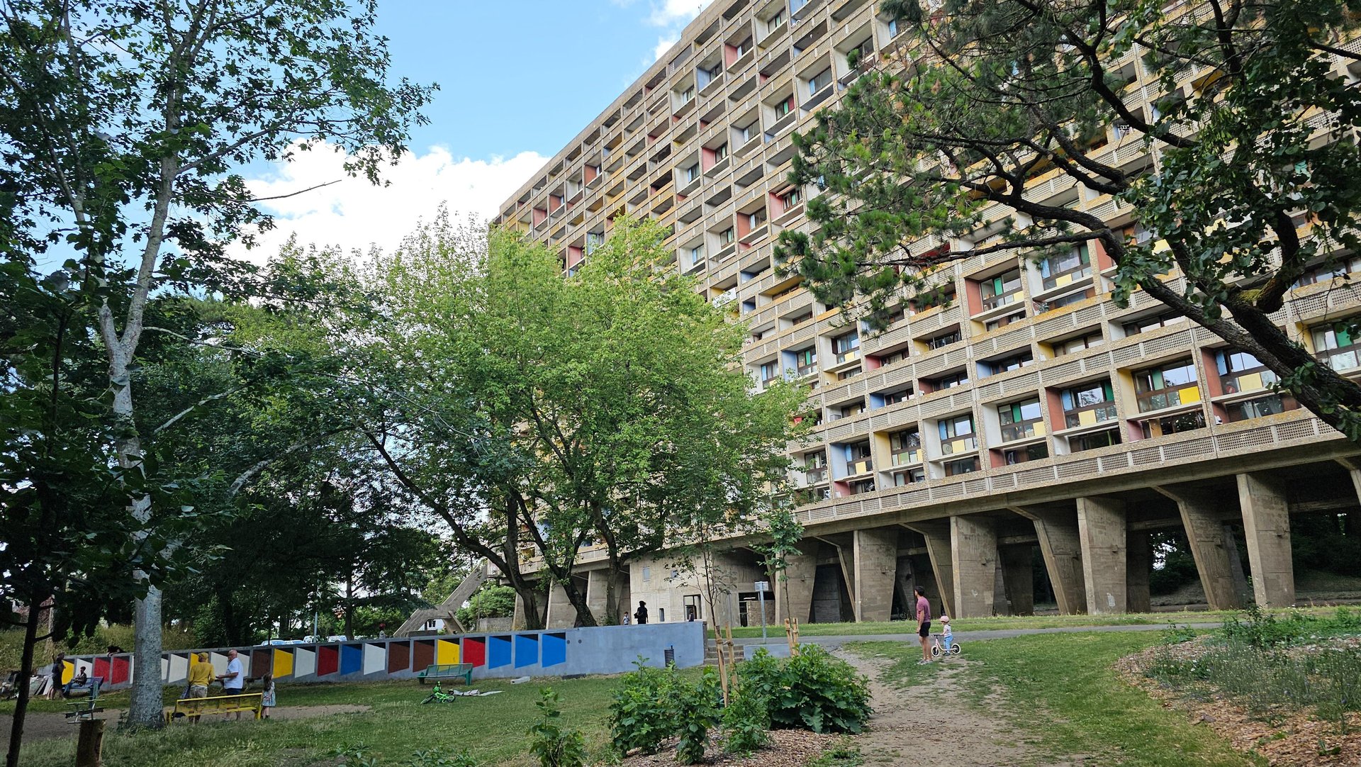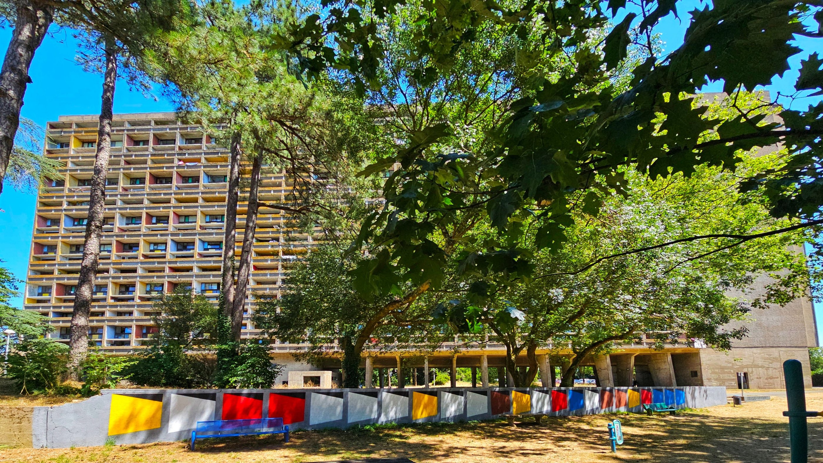 Cette fresque n'est pas seulement une peinture murale, c'est le fruit d'une magnifique collaboration et d'un véritable élan communautaire. Elle a été entièrement réalisée avec la participation des habitantes et habitants de la Maison Radieuse, petits et grands, qui ont uni leur énergie pour donner vie à ce projet. L'œuvre représente le niveau 14 de la Maison Radieuse, un hommage vibrant à l'architecture et à l'esprit de Le Corbusier qui animent notre quotidien. C'est une manière unique de marquer cet anniversaire et d'offrir un nouveau regard coloré sur notre patrimoine.