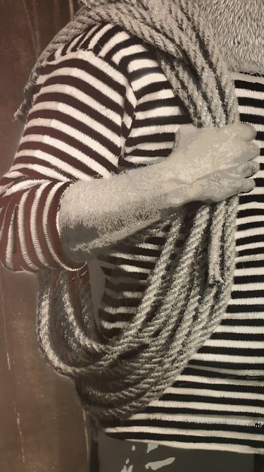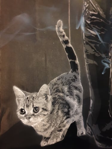 Cette pièce est dédiée à l'âme maritime et à la résilience des marins bretons, dont l'histoire et le labeur sont profondément ancrés dans l'identité nantaise. J'ai choisi de représenter un marin au visage buriné par les embruns et le large, incarnant la tradition et le courage. À ses pieds repose un chat, fidèle compagnon des ports et des navires, symbole de chance et de foyer. Le tableau lui-même est le fruit d'un engagement technique intense : 260 heures de travail méticuleux ont été nécessaires pour découper et superposer les 98 pochoirs qui donnent à cette figure sa texture, sa profondeur et son intensité dramatique. C'est une célébration de la mer et de ceux qui la défient.